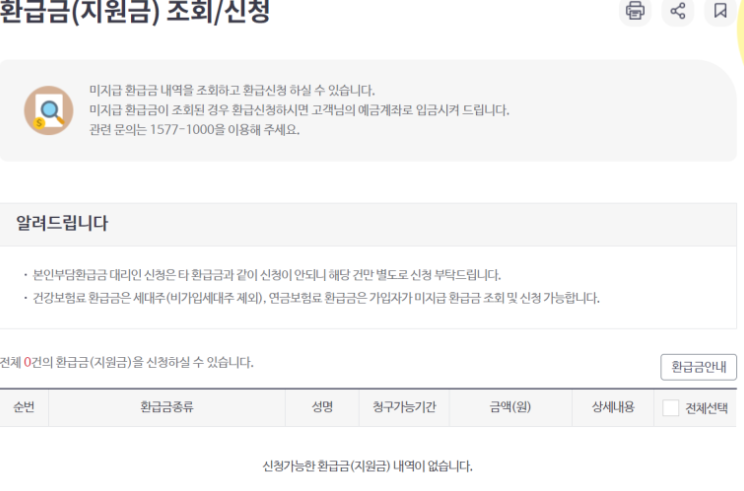 환급금이 있으시면 여기 환급가능한 금액이 표시되며 환급신청을 바로 하시면 됩니다.